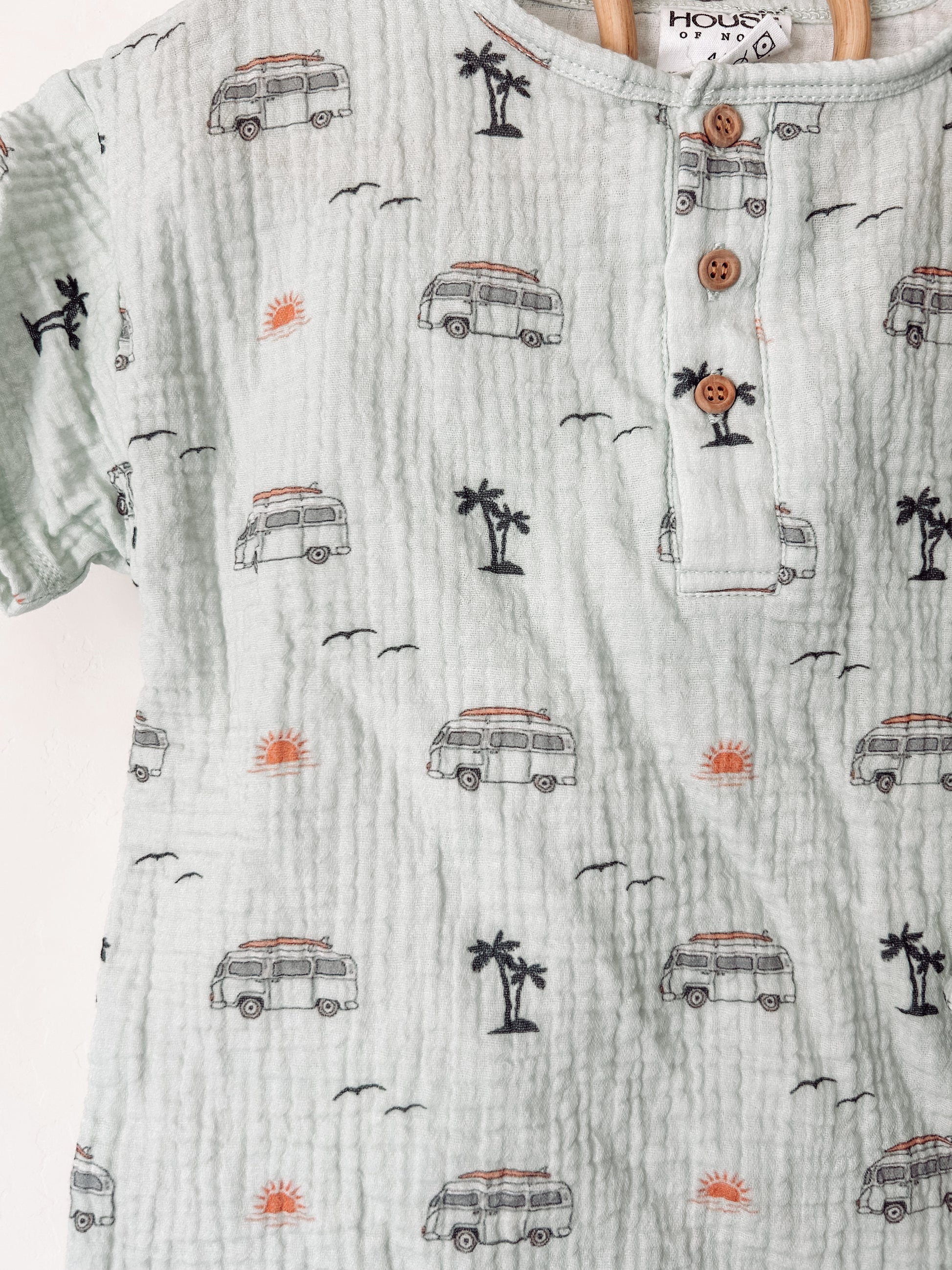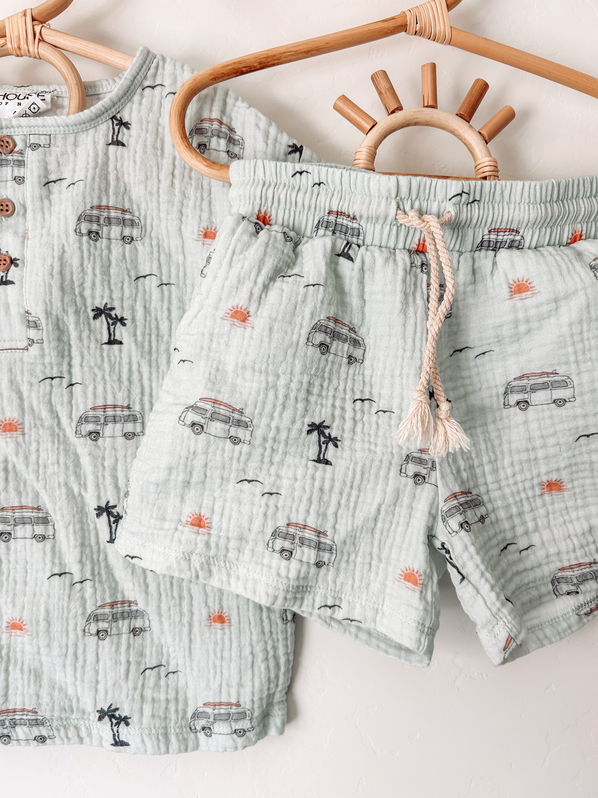 Easy, effortless, and made for adventure — the Coastal Cruiser Set is pure California cool. Crafted from 100% breathable muslin cotton, this two-piece outfit is as soft as a sea breeze and perfect for all-day play. The lightweight button-up shirt features a relaxed fit and natural texture, while the matching shorts include a functional drawstring for a comfy, adjustable fit.