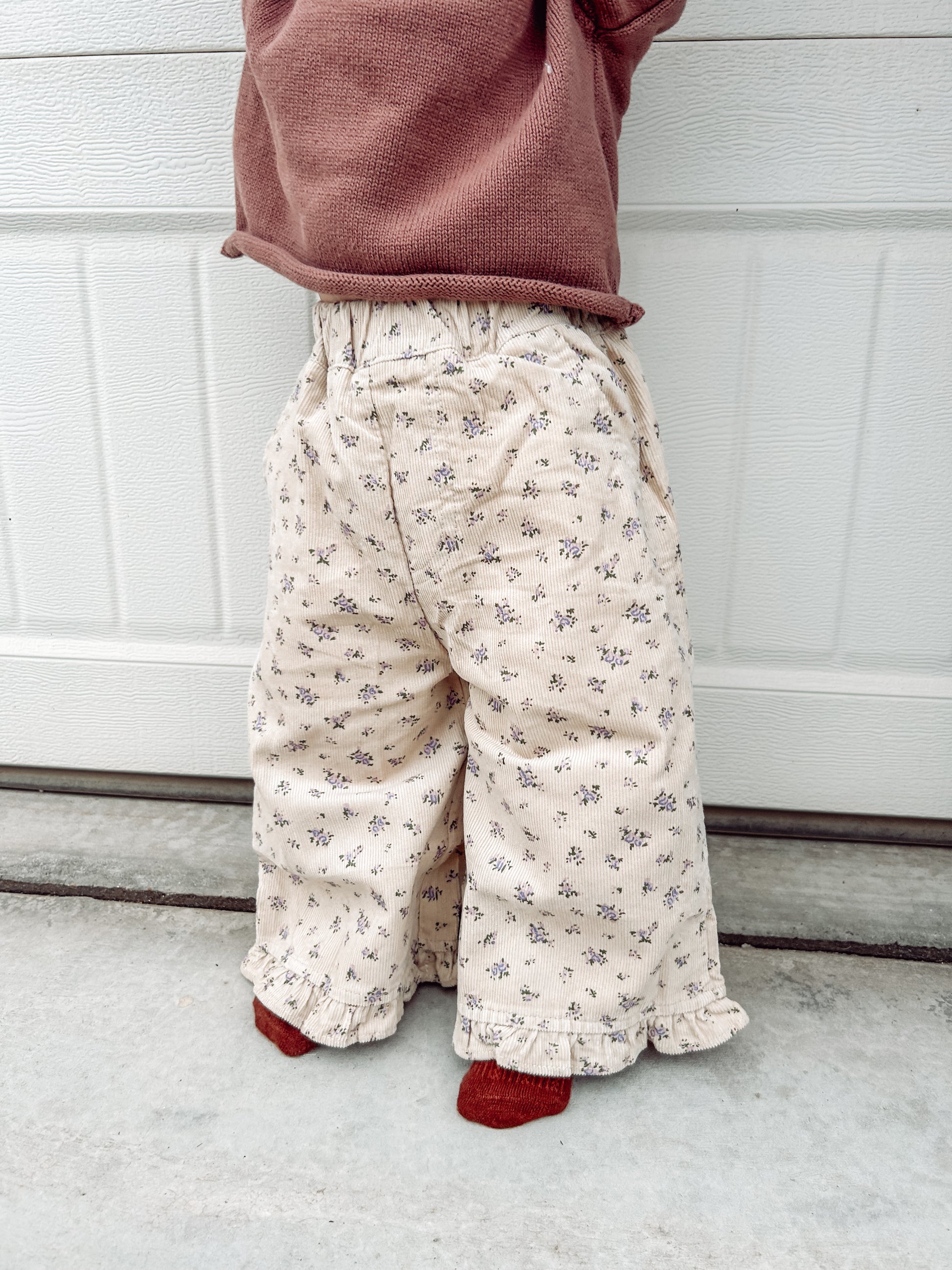 The Ivory Bloom Pant is a sweet little standout—soft, charming, and full of vintage-inspired whimsy. Crafted from cozy corduroy in a warm ivory tone and sprinkled with a delicate floral print, these pants bring a dreamy, storybook feel to everyday dressing. The playful ruffle hem adds an extra touch of fluttery charm, making them perfect for twirling, exploring, and all the moments in between.